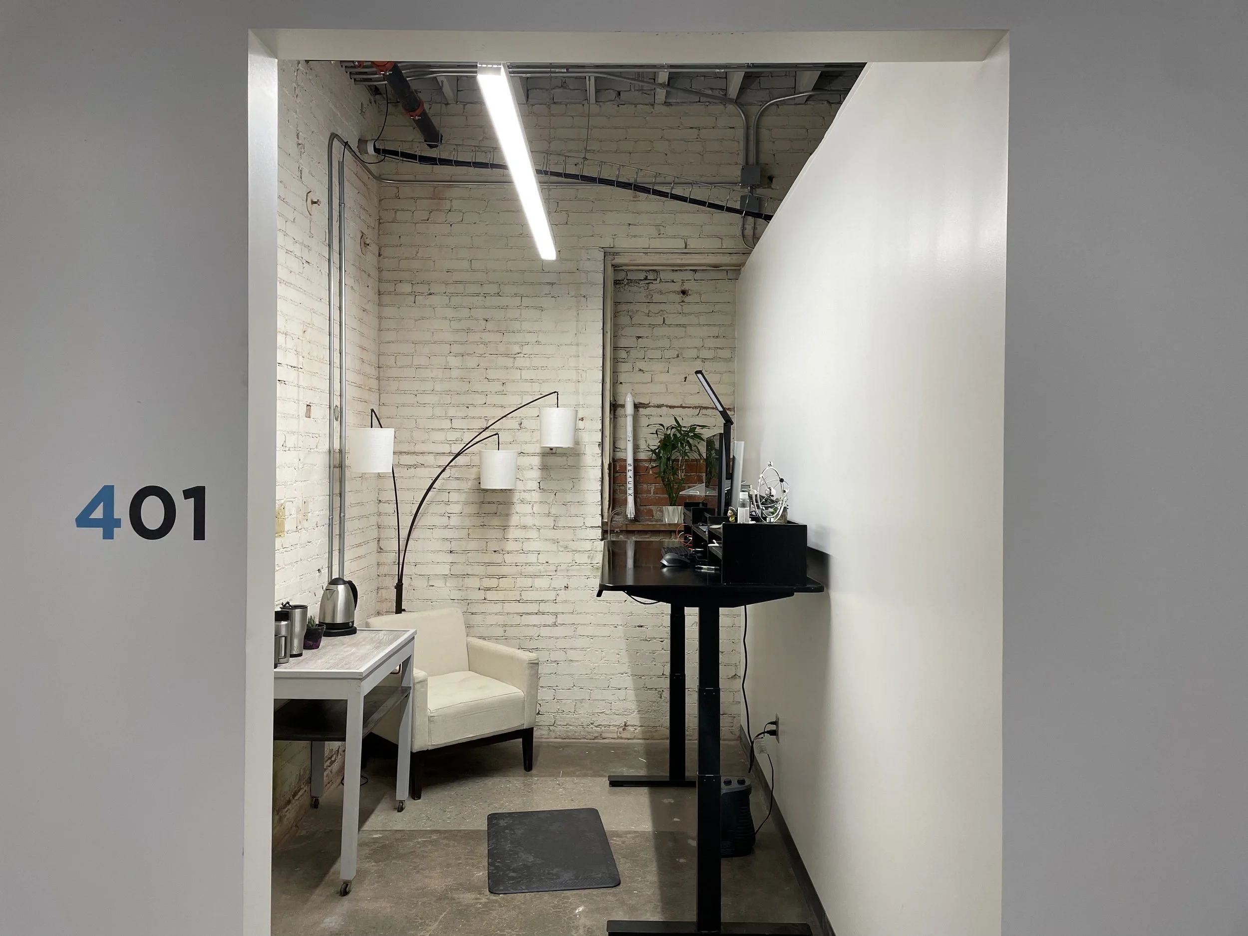 Studios come unfurnished, so you can bring in your own desk, chairs, workbenches—whatever you need to get your work done. The studios do not come with doors, but several of our members draw blackout curtains across the entryway when they need privacy. Studio features include:
